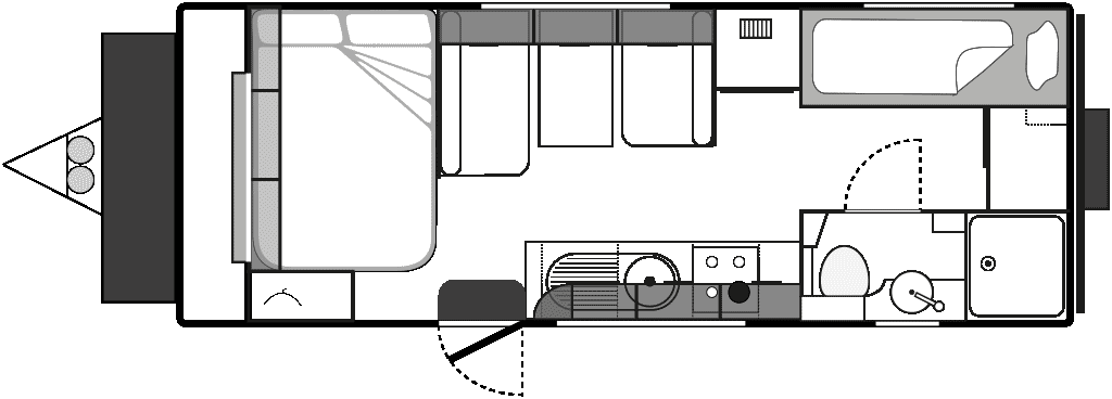 - Convertible Bed: Café dinette seating converts to 1x single bed.